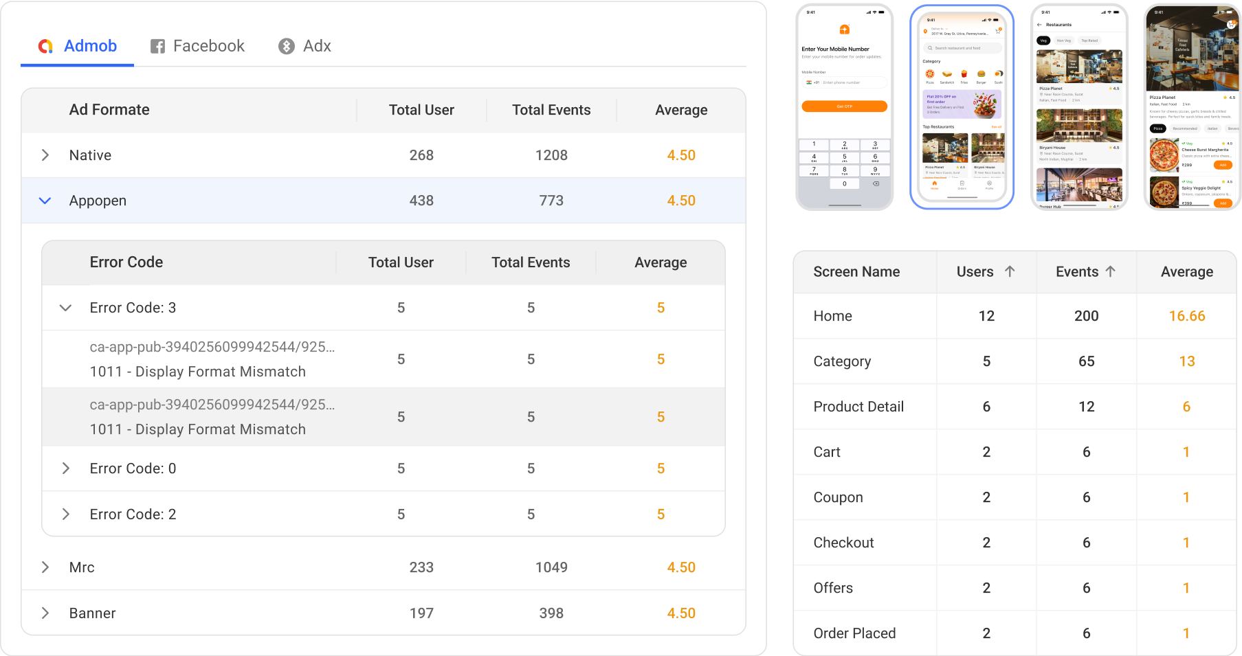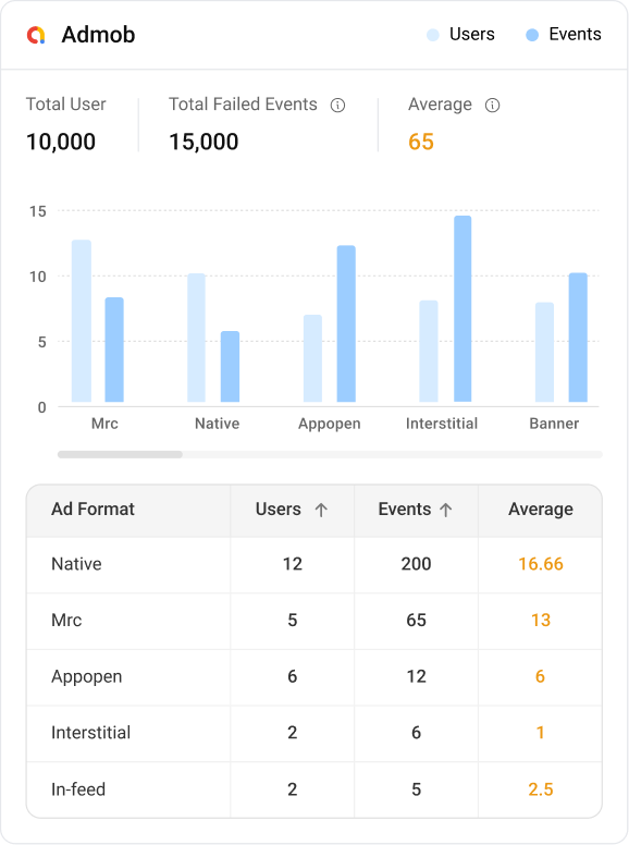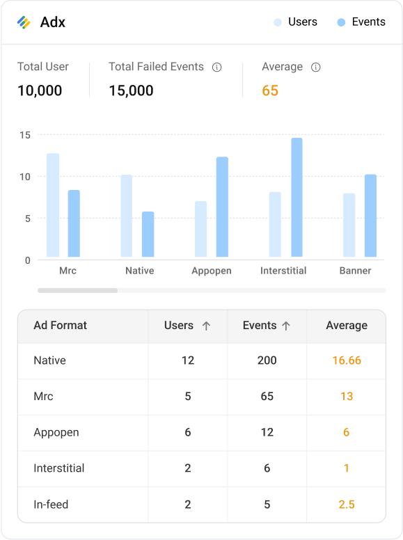 Gain deep visibility into ad delivery issues by analyzing failed events by ad format, error codes, and impacted screens.