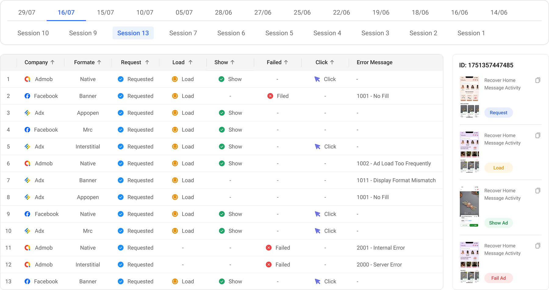 View every failed ad event by format, error code, and screen - helping you identify exactly where issues occur.